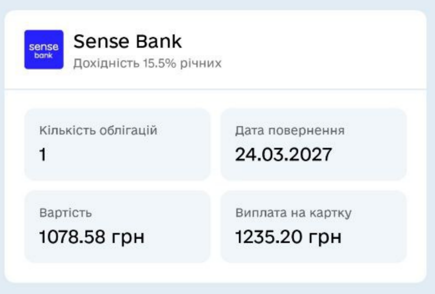 В Sense Bank ми можемо придбати облігацію за 1078,58 грн, а 24.03 отримаємо 1235,20 грн, чистий прибуток - 156,62 грн