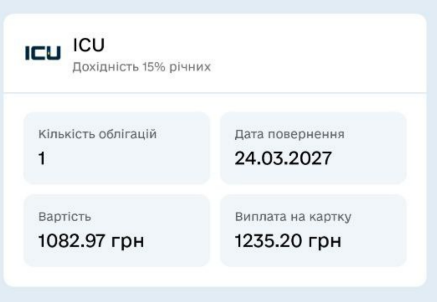 В ICU ми можемо придбати облігацію за 1082,97 грн, а 24.03 отримаємо 1235,20 грн, чистий прибуток - 152,23 грн